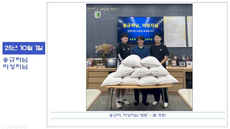 25년 10월 1일 송규하, 이성지님 후원품 전달 페이지 정보 작성자 운영자 댓글 0건 조회 66회 작성일 26-01-31 12:15 본문 송규하, 이성지님께서 방문하여 쌀을 후원해 주셨습니다. 감사합니다. 목록 이전글25년 10월 1일 시민정원사 정원 조경봉사 26.01.31 다음글25년 9월 29일 안양과천교육지원청 후원금 전달, 9월 일정공지 26.01.31 댓글목록 댓글목록 등록된 댓글이 없습니다.