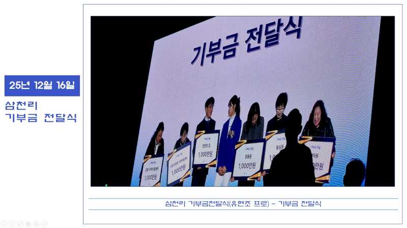 25년 12월 16일 삼천리 기부금 전달식(유현조 프로) 페이지 정보 작성자 운영자 댓글 0건 조회 90회 작성일 26-02-02 16:54 본문 삼천리 스포츠단 유현조 프로님께서 안양의집에 기부금을 전달해 주셨습니다. 감사합니다. 목록 이전글25년 12월 16일 티랩 후원금 전달 26.02.10 다음글25년 12월 12일 펄어비스 김대일문화재단 - 정장 지원사업 전달식 26.02.02 댓글목록 댓글목록 등록된 댓글이 없습니다.