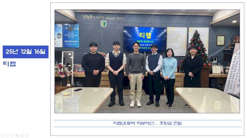 25년 12월 16일 티랩 후원금 전달 페이지 정보 작성자 운영자 댓글 0건 조회 32회 작성일 26-02-10 11:40 본문 티랩(유튜버 리뷰머신)에서 후원금 전달을 해주셨습니다. 감사합니다. 목록 이전글25년 12월 18일 삼천리성탄행사 26.02.10 다음글25년 12월 16일 삼천리 기부금 전달식(유현조 프로) 26.02.02 댓글목록 댓글목록 등록된 댓글이 없습니다.